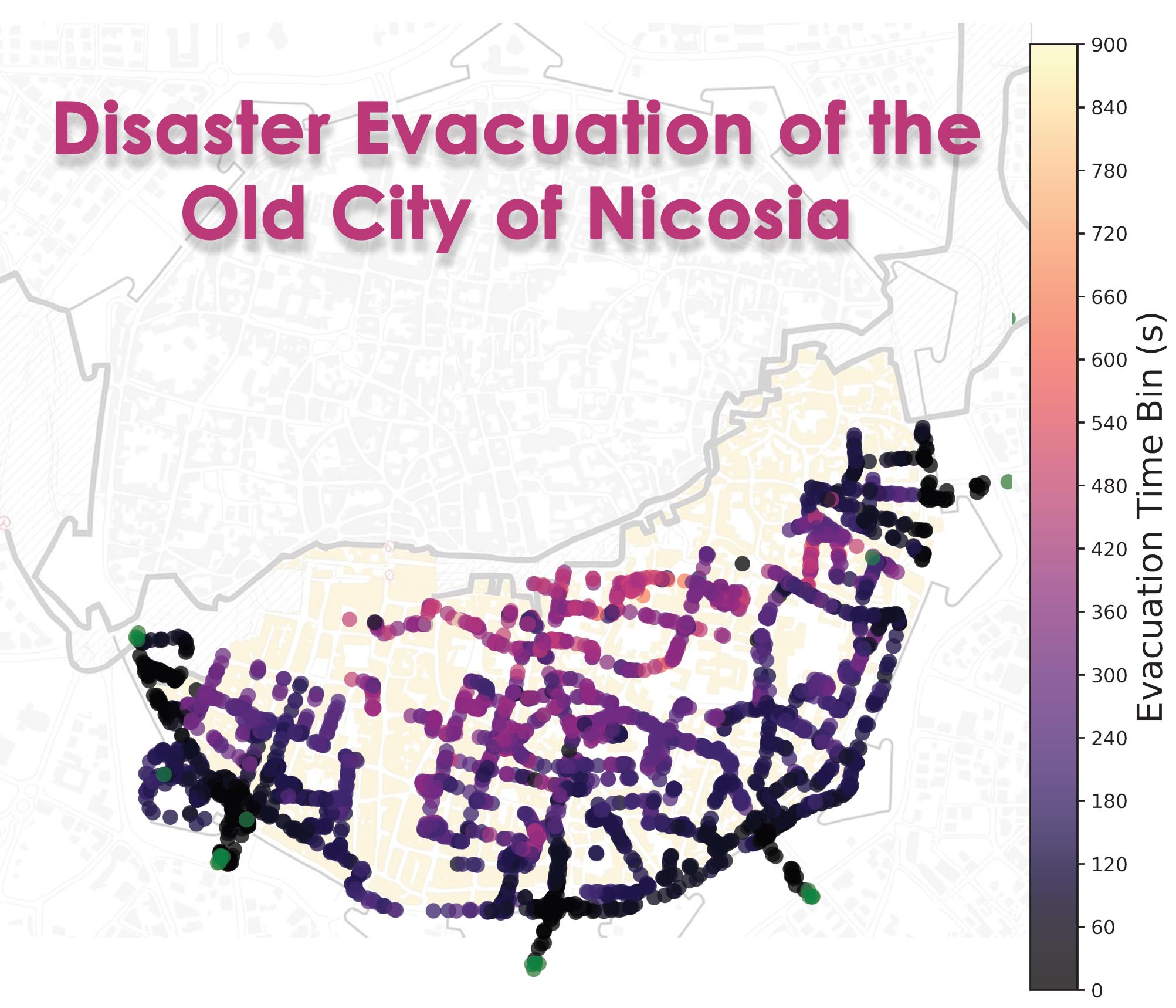 This paper presents a digital twin–based simulation of evacuation scenarios in Nicosia’s historic walled Old Town, showing how dense urban morphology, gate blockages, and infrastructure changes affect evacuation efficiency and highlighting the need for coordinated, adaptive flow-management strategies to reduce disaster risks in historic cities.